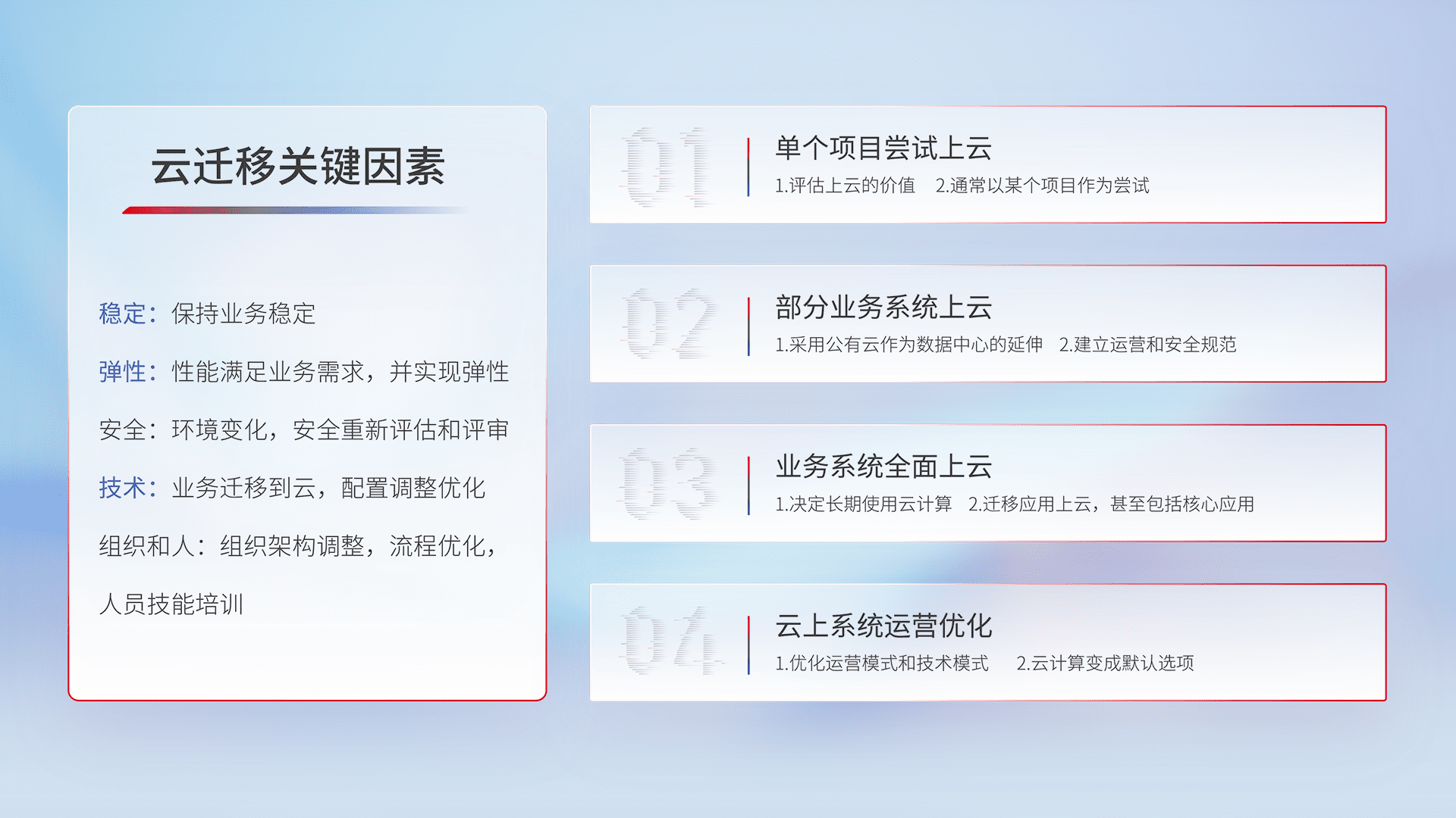 结合实际业务,,从规划设计、、、云平台选型、、云原生改造、、、、数据迁移、、、、集成交付,,,迁移全过程为客户识别最佳上云路径,,,做好风险识别管理,,设计网络架构、、身份权限、、、、安全审计合规、、、操作审计、、、日志审计、、、、监控告警策略、、、、多站点容灾设计等,,,,对云上基础设施进行整体规划,,,提升IT治理水平,,以满足弹性、、、高可用、、、高性能的需求。。