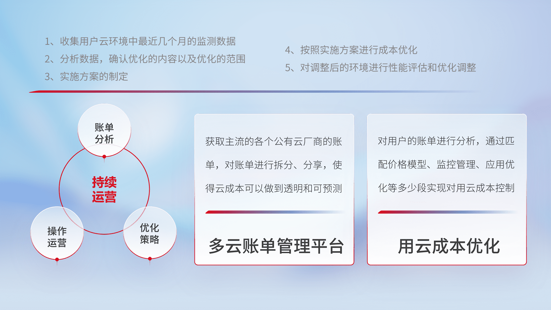 通过多云纳管,,以统一的资源数据模型把客户的云资源进行抽象和封装,,,,进而实现对多云资源的统一操作,,保障云资源管理的可靠性、、、稳定性与可用性。。量身定制化运维内容,,配置、、开发运维、、、、补丁管理、、、、备份、、、监控、、、认证和访问管理、、、、审计和日常巡检等,,,保障在用云过程中的可靠度,,稳定度以及高可用率。。。